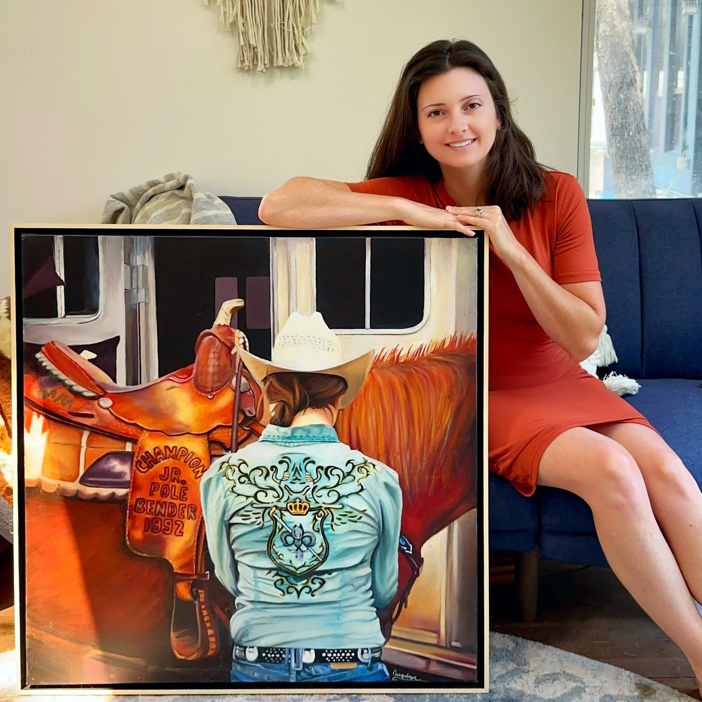 Her personal history, rooted from deep in the Texas Hill Country as a cowgirl and World Champion Qualifier for the National Barrel Horse Association in 2015 continues to shape her artistic vision, bringing authenticity and lived experience to her depictions of horses and western life. She was also a country swing competitor and dance instructor from 2014-17, and still maintains a deep love for dancehalls and country music, influences that inform her vibrant paintings of movement, neon light, and rhythm.